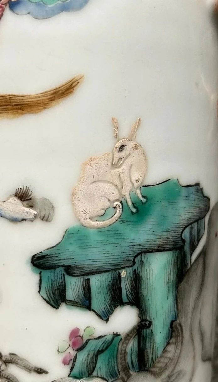 生肖瓷一直是收藏的熱門種類。我有一乾隆年間的小尊,上面繪制著十二生肖,其中夾雜的歷史小故事耐人尋味。此尊為官窯所出,畫師很有經驗,不想給自己帶來麻煩,在繪畫時把兔子的尾巴加長。因為乾隆屬兔,該避忌的,還是要避忌,畫短了就會陷入“兔子尾巴長不了”之坑,惹上殺身之禍。